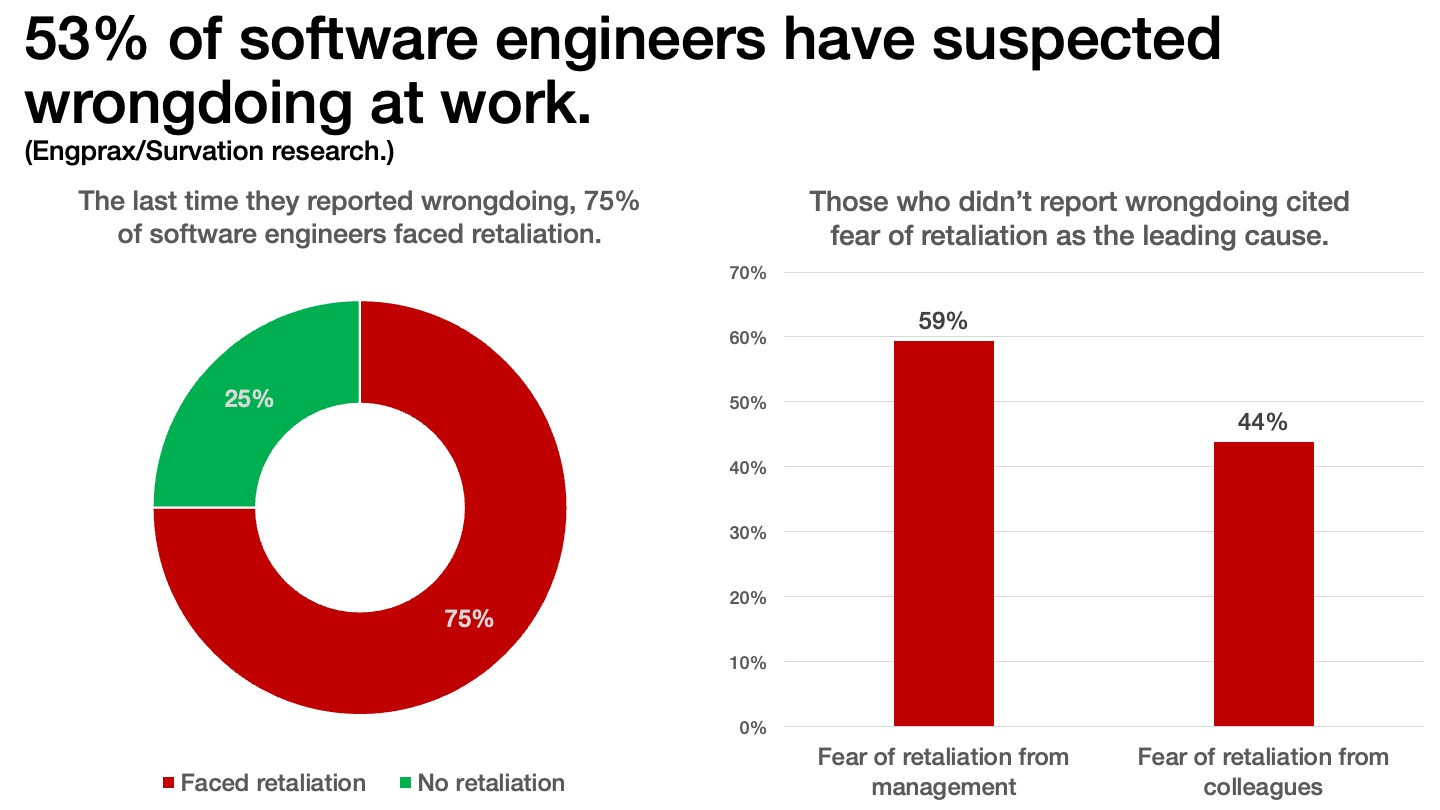 53% of software engineers surveyed by the polling firm Survation say they’ve suspected wrongdoing at work. Of those who speak up, 75% report facing retaliation the last time they reported wrongdoing to their employers. This amounts to ~145,000 active software engineers in the UK having experienced retaliation the last time they reported wrongdoing to their employers, more victims than there are Regular Forces in the British Army, Royal Air Force and Royal Navy combined. In instances where software engineers stayed silent, the top two reasons cited were potential retaliation from management (59%) and potential retaliation from colleagues (44%).